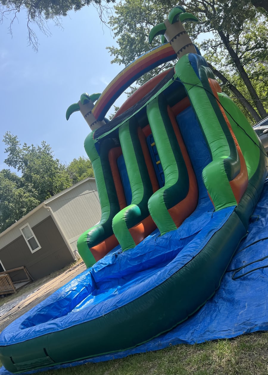 Kelly's Party Rental delivers and sets up the Tropical Dual Lane Rainbow Waterslide across various locations, including Tyler, Flint, Bullard, Chandler, Frankston, Lindale, Jacksonville, Whitehouse, Arp, and Troup. Our professional team ensures everything is installed correctly and safely, allowing you to focus on enjoying the event.