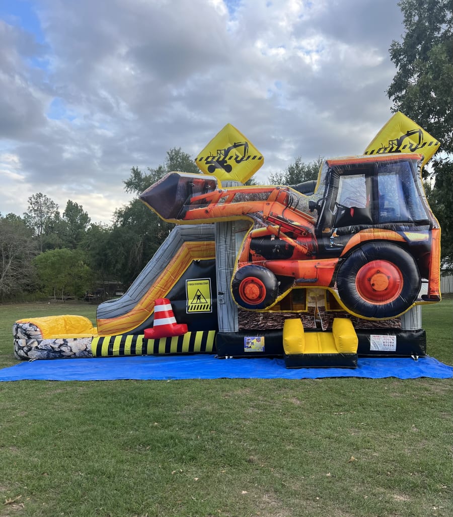 Kelly's Party Rental ensures reliable delivery and professional setup of the Construction Bounce House & Slide Combo across various locations, including Tyler, Flint, Bullard, Chandler, Frankston, Lindale, Jacksonville, Whitehouse, Arp, and Troup. Our team takes care of all the details, allowing you to focus on enjoying the event.
