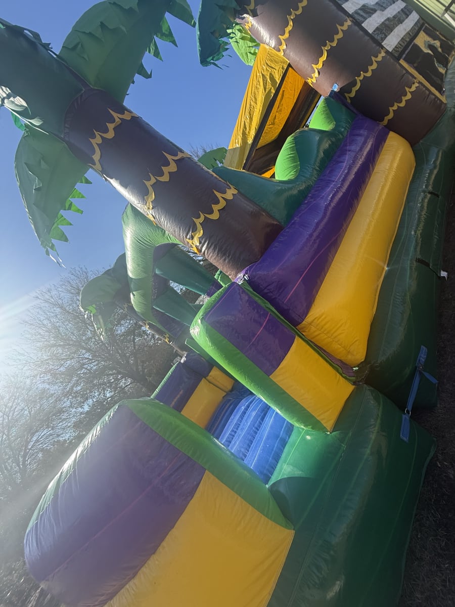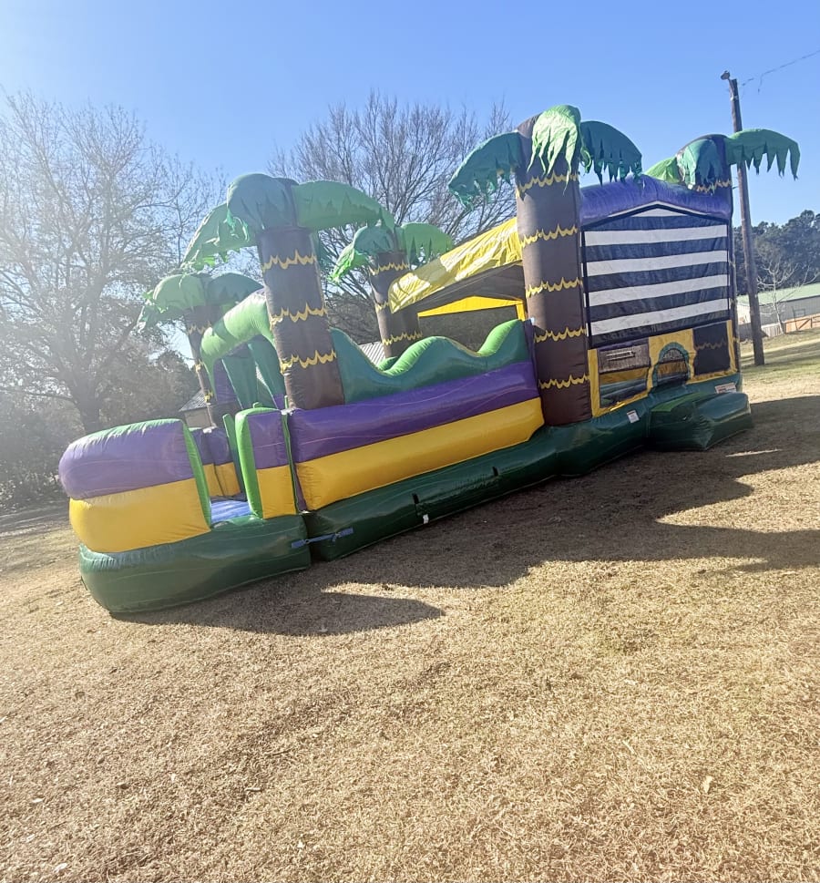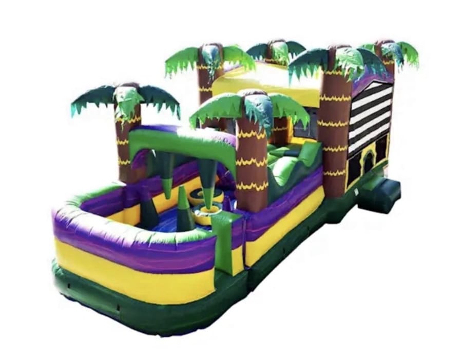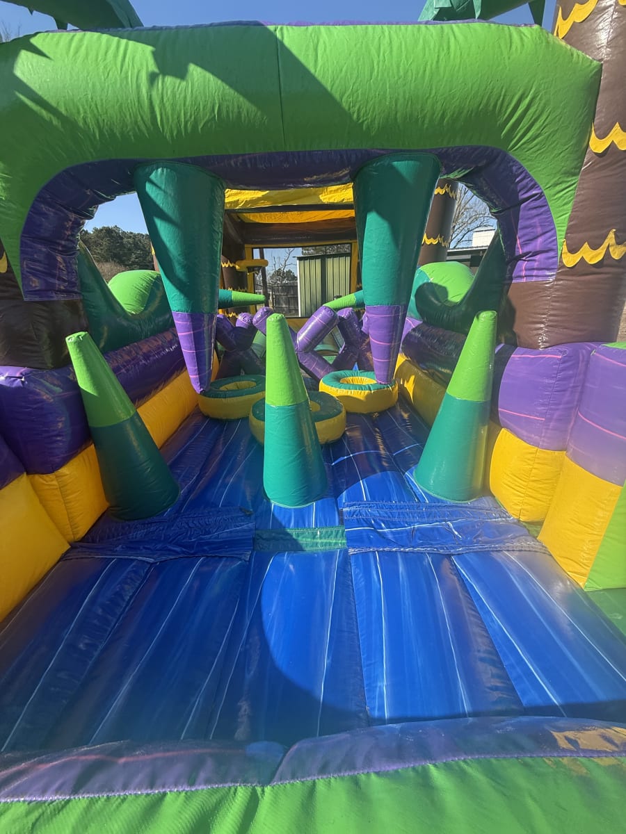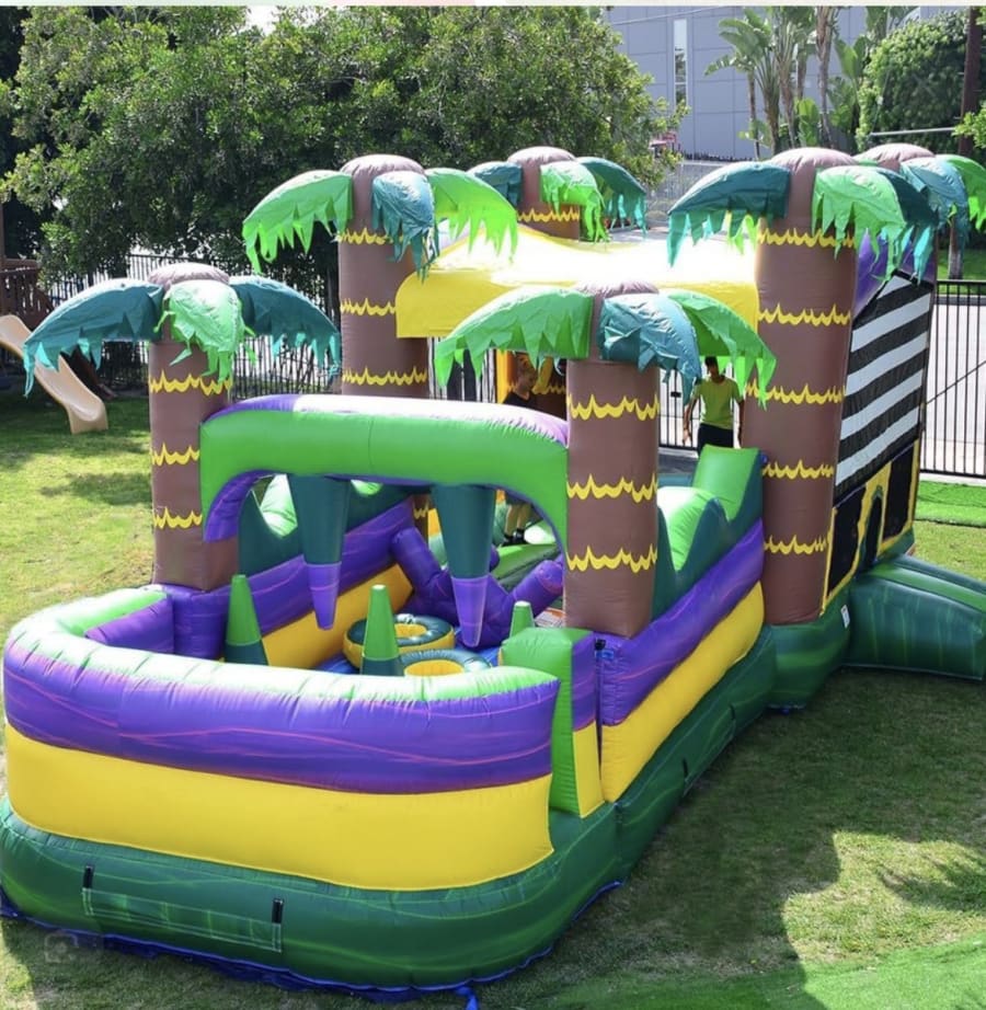 Bring island energy to your next event with the Palm Beach Obstacle Bounce House. This tropical-themed inflatable combines bright colours, towering palm trees, and non-stop activity into one impressive unit. With its bold green, yellow, and purple design and detailed palm tree features rising above the structure, it instantly transforms any yard, school field, or event space into a lively tropical playground.