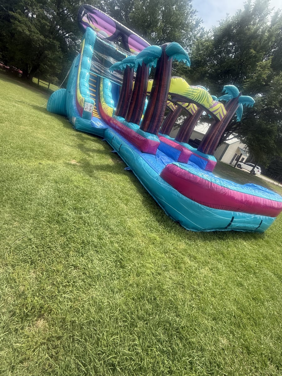 Bring the beach to your backyard with the Miami Beach Waterslide from Kelly’s Party Rental! This massive 22ft tall inflatable features dual lanes for double the racing fun, leading into an extended slip n slide section that ends in a splash zone. Designed with bright tropical colours and inflatable palm trees lining the sides, it’s a standout attraction for summer birthdays, block parties, school events, and more.