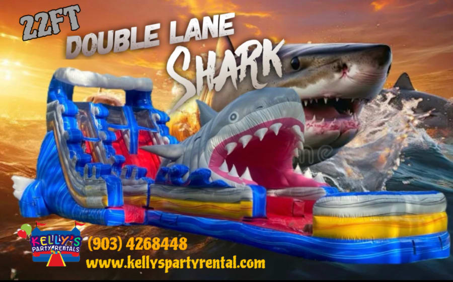 Take your party to jaw-some new levels with the 22ft Shark Double Slide from Kelly’s Party Rental! This thrilling dual-lane inflatable water slide is guaranteed to make a splash at any event. Towering at 22 feet tall, this showstopper features a giant 3D Great White Shark with its mouth wide open—ready for brave riders to zoom through and out the other side!