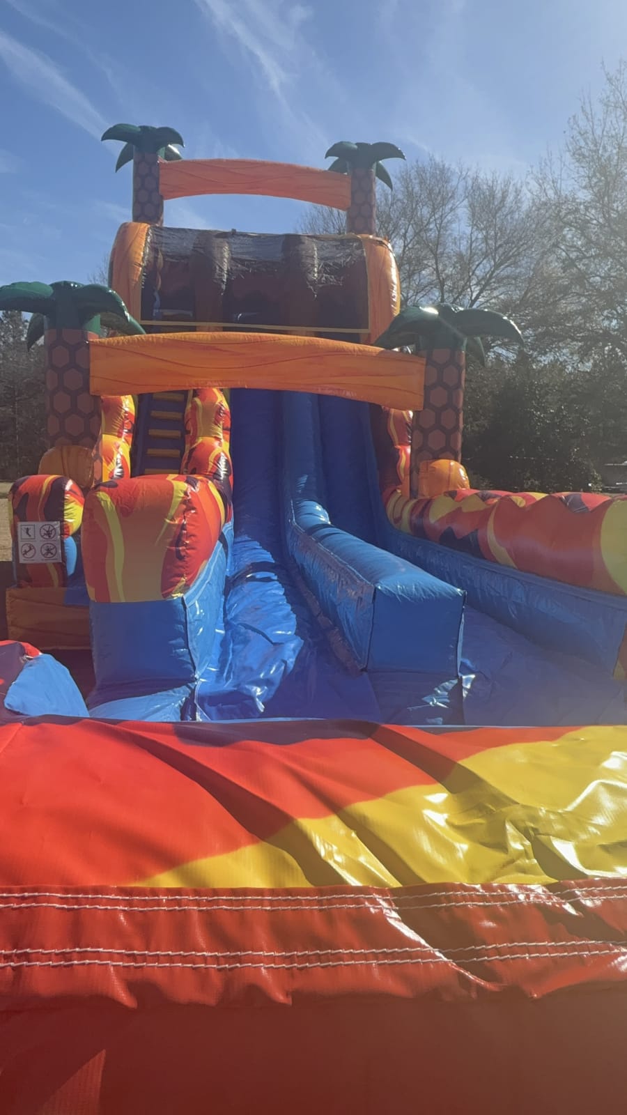 Make a bold statement at your next event with the 22’ Tropical Fiesta Waterslide (Wet & Dry). This towering inflatable is designed to stand out, featuring vibrant orange and blue colours with palm trees rising above the slide platform. Its tropical theme and impressive height make it a true centrepiece for outdoor parties, school events, church gatherings, and large community celebrations.