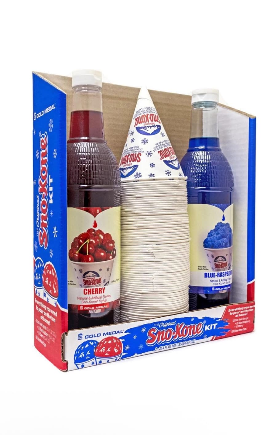 It’s everything you need to pour on the fun and savor the icy treats! Each kit contains 1 Cherry Sno-Kone® Syrup (25.4 fl oz), 1 Blue Raspberry Sno-Kone® Syrup (25.4 fl oz), and 50 Sno-Kone® Cups.