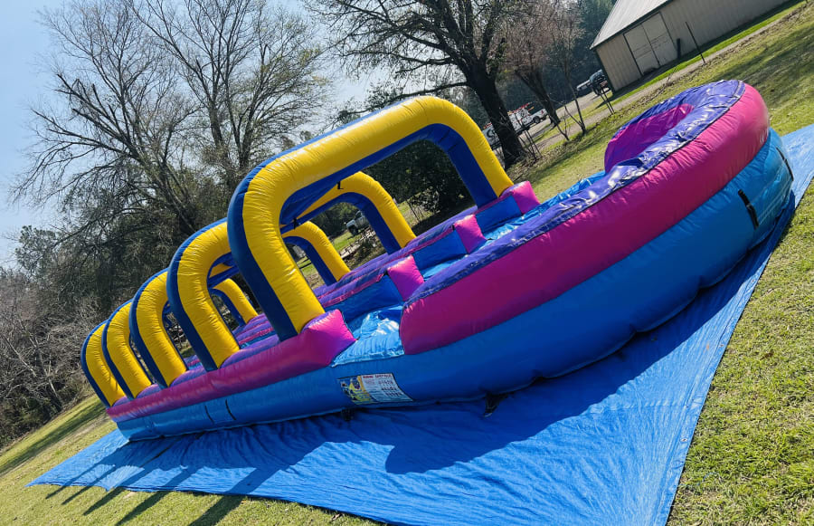 - Safety and Convenience: Each rental includes a tarp that goes underneath the inflatable to ensure stability and safety during use. A water hose is attached to sprinkle water on all three lanes, ensuring a smooth and slippery ride.